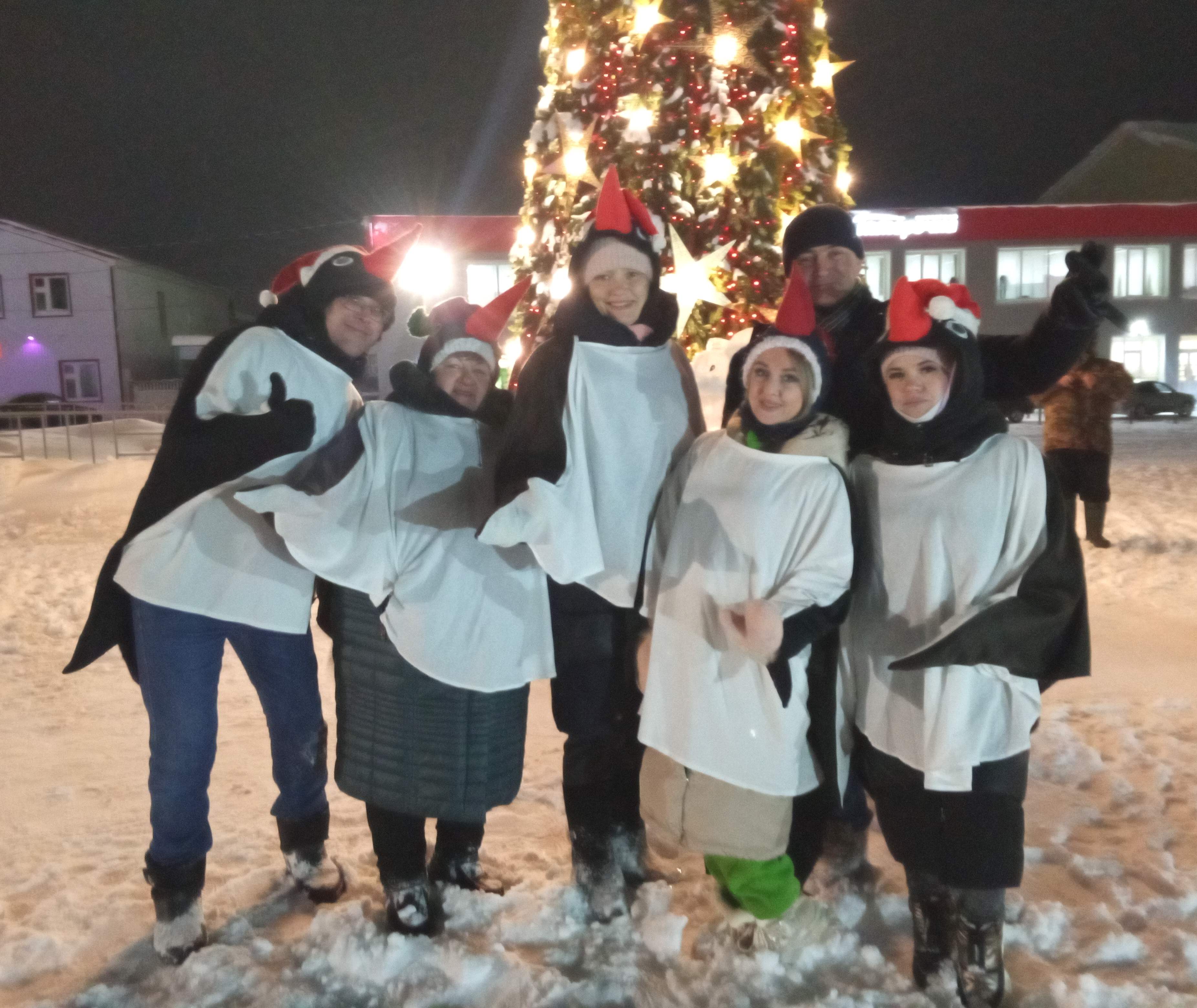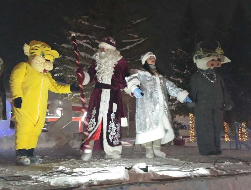 На сцене появляются главные герои – Дед Мороз, Снегурочка, Бычок и символ Нового года Тигр. А у елки другие персонажи - группа Пингвинов, Белка. Звучат поздравления с Новым годом от Деда Мороза и разыгрывается небольшая сценка. Затем все вместе в хороводе вокруг елки поют песню про Елочку, а потом все дружно танцуют, выполняют под музыку флэш-моб. Сотрудники ЦДТ и молодежного отдела, тренеры СОК «Дельфин» проводят занимательные спортивные игры с детьми, но и взрослые не остаются в стороне, они также принимают участие и помогают детям. Шутки и смех слышится вокруг, несмотря на зимнюю погоду, становится тепло во время игр и танцев. Вот группа женщин из клуба «Будь здоров» и хора ветеранов «Калинушка» в центре площадки танцуют с задором и энергично, какие они зажигалки, несмотря на возраст!