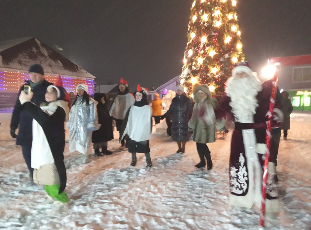 Завершающий праздник 13 января «Старый Новый год спешит к нам в гости» организовали и провели сотрудники РДК, ЦДТ, отдела по молодежной политике, спорту и туризму исполнительного комитета района. Погода была новогодняя, легкий снежок и небольшой морозец придавали сказочный вид елкам и деревьям – большие белые пушистые шапки на ветвях, а среди них разноцветные светились огоньки. Новогодняя музыка радует собравшихся, около елки танцуют все.