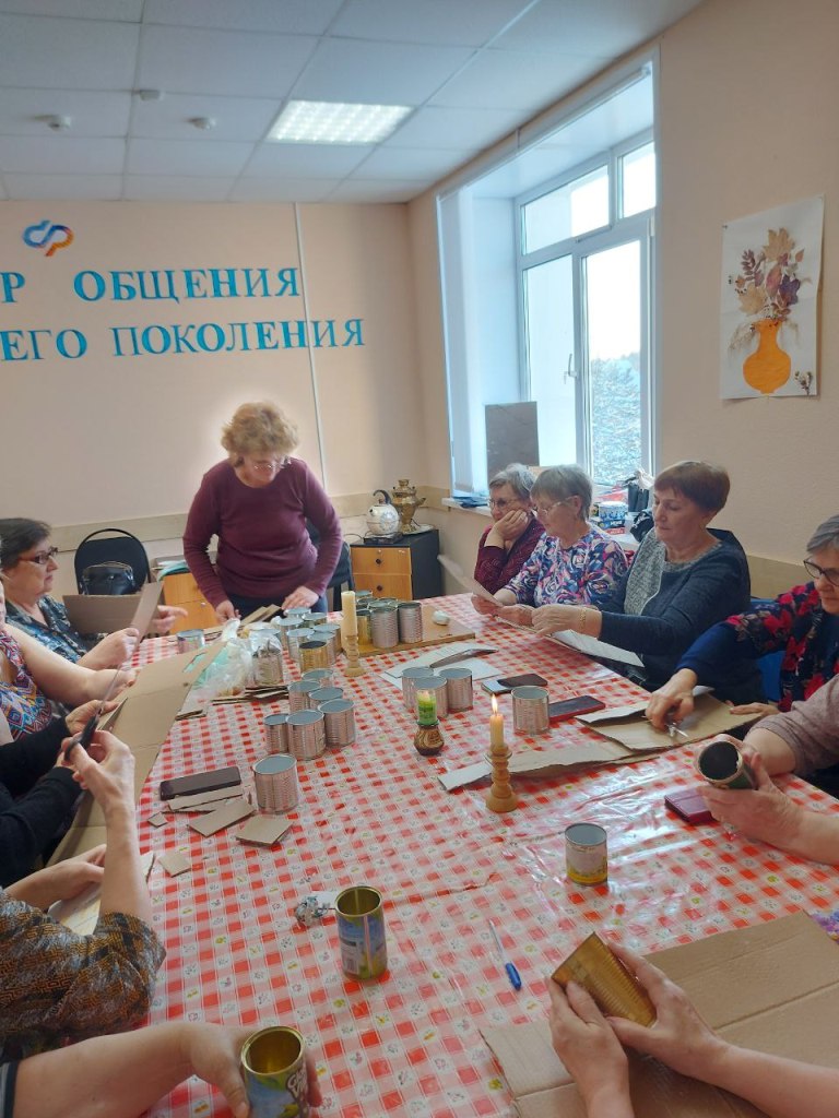 Члены Местного отделения Союза пенсионеров Спасского района и активные посетители центра общения старшего поколения собрались вместе для изготовления окопных свечей и последующей отправки их в зону проведения СВО.