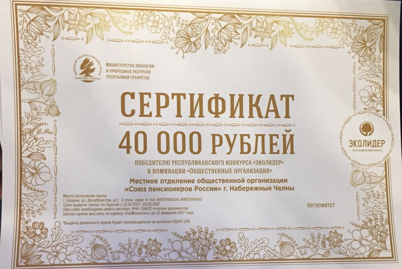 Челнинское отделение общественной организации «Союз пенсионеров России» стало лауреатом в номинации «Общественные организации» - победителю вручили диплом 1 степени и сертификат в размере 40.000 рублей!