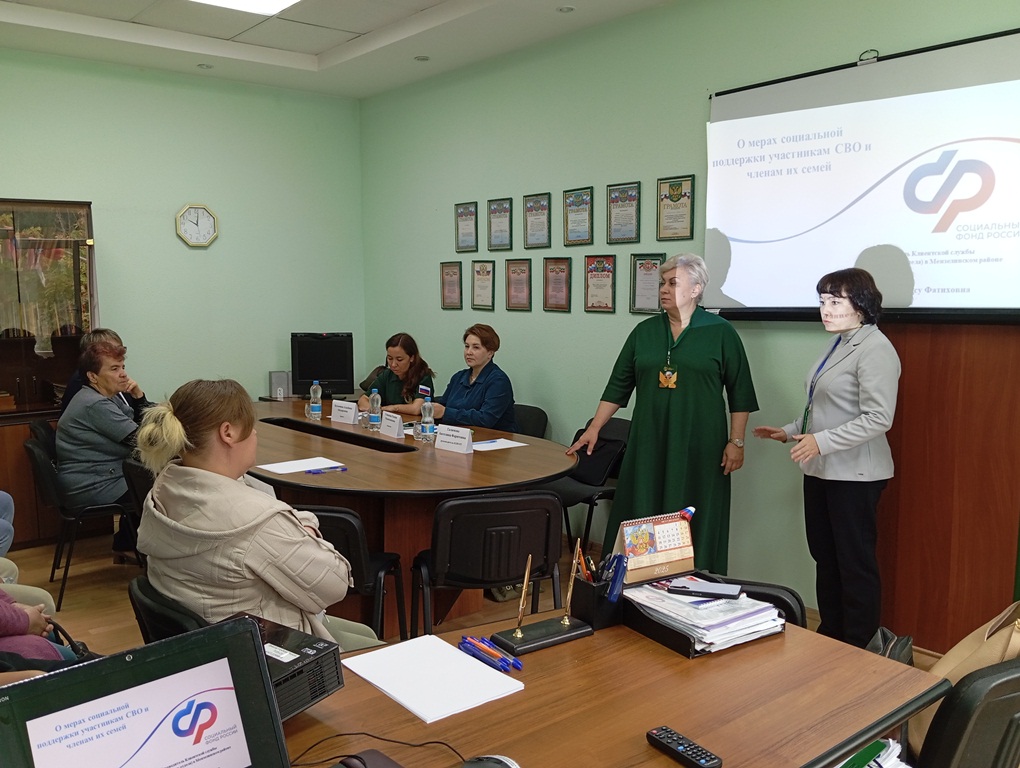 Руководитель Татарстанского Комитета семей воинов Отечества Галимова Ангелина Фаритовна ознакомила присутствующих с деятельностью Комитета, направленную на оказание психологической, юридической, помощи в работе с обращениями, вопросам компенсаций и выплат, информационной поддержки, отработки проблемных ситуаций. Индивидуальные консультации провели сама руководитель и юрист и психолог Комитета. Некоторые вопросы были решены на месте, часть вопросов взята ими в работу. Сотрудники клиентской службы СФР параллельно консультировали по мерам поддержки участников СВО и членов их семей.