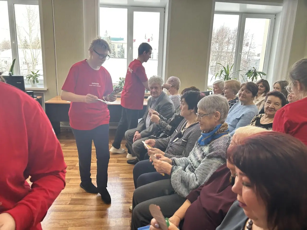 Поздравить посетителей Центра Общения старшего поколения пришли активисты Движения Первых, в лице учащихся Заинской средней школы №9, ребята вручили каждой присутствующей открытку, сделанную своими руками — очень трогательный и личный жест..